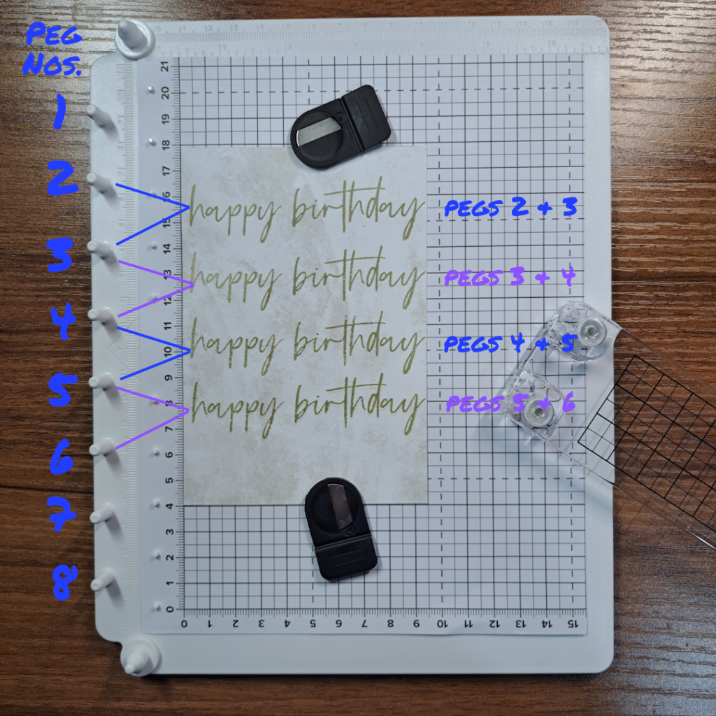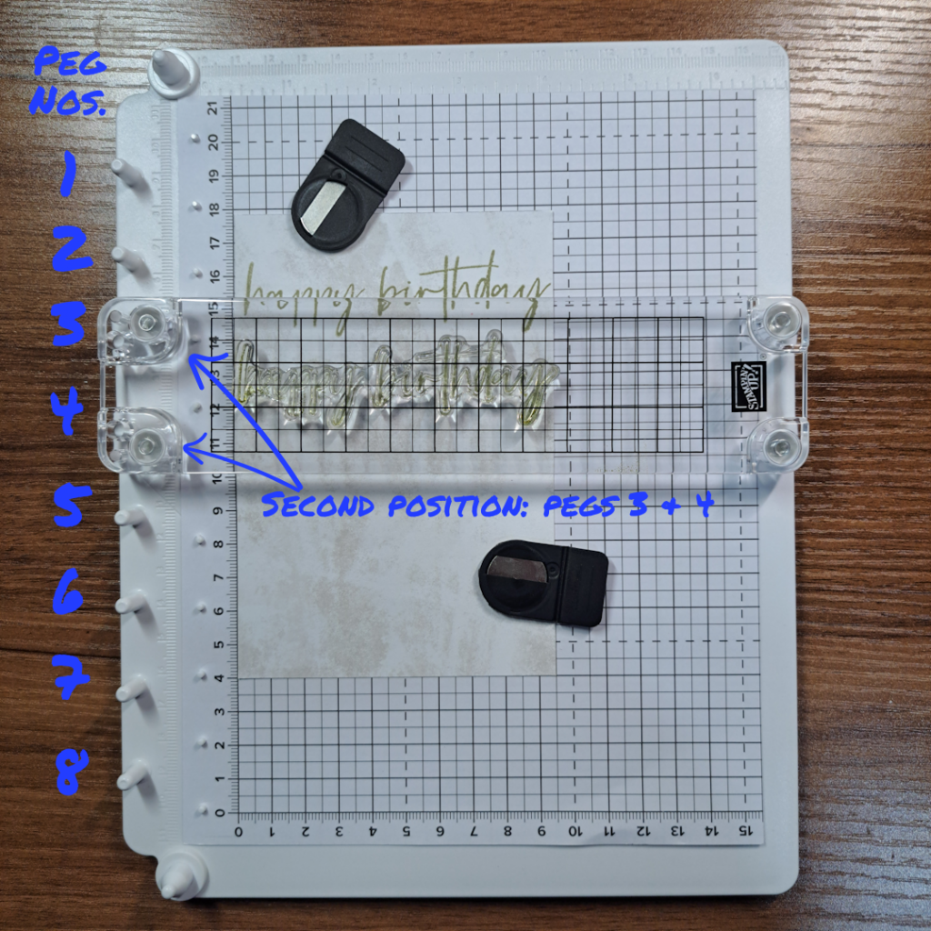 Now when you place the plate over the paper to stamp the image, move down one peg. Repeat the same pressing down action to stamp the second image. For this example I only moved down one peg at a time. But I would like to note that you can move the clear bar plate down as many times as you wish to create more space between images. I think it is easy to see that you can quickly stamp an evenly spaced row of images.