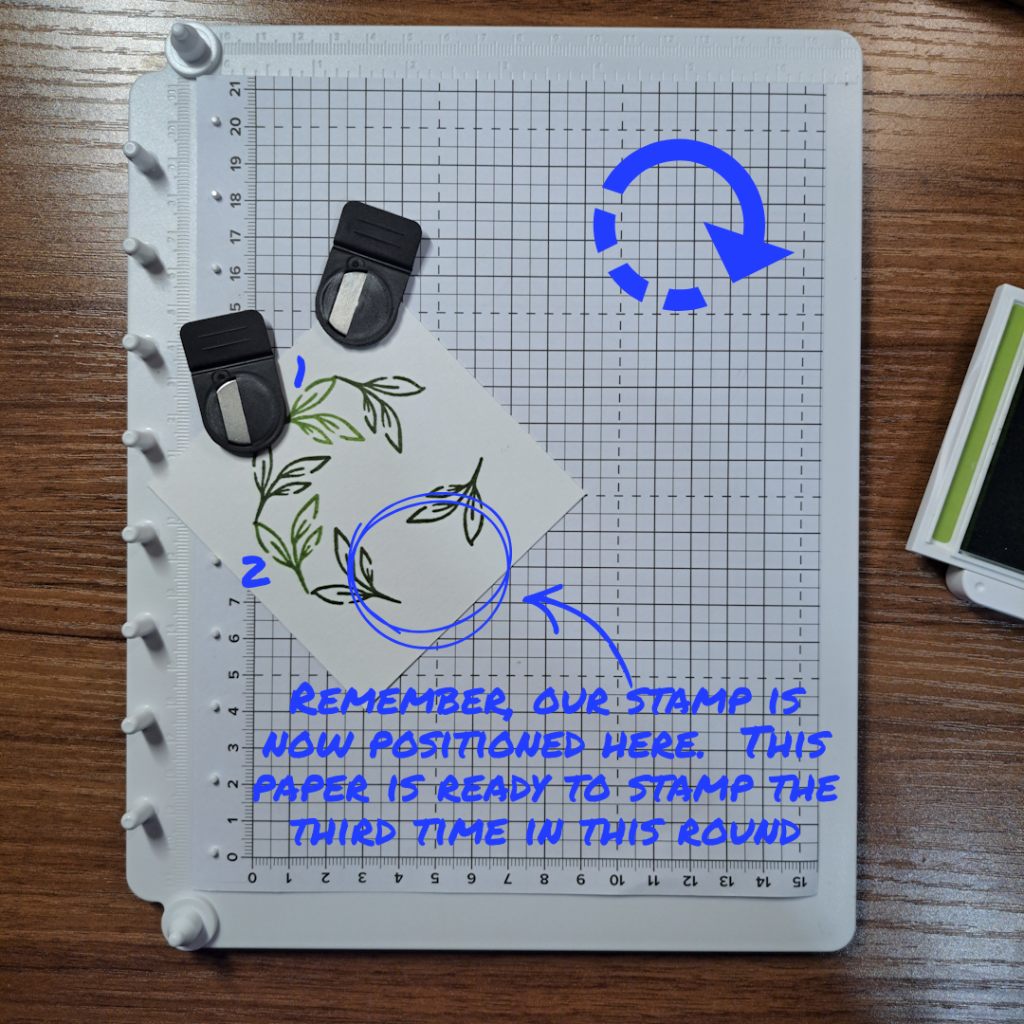 Working the same as in the first round I stamped, and then rotated my paper a quarter turn and stamped again without moving the stamp. Continuing on until I had stamped my paper four times in total.
