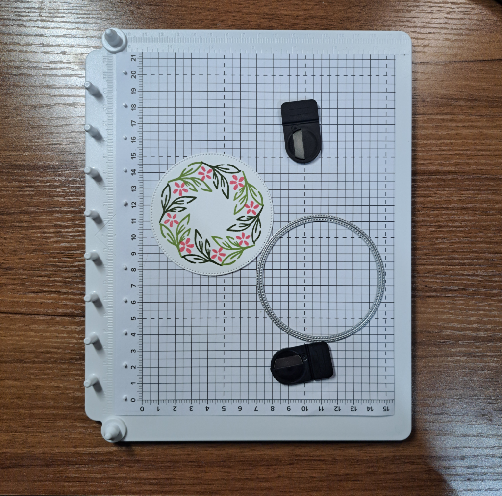 To actually make a round circle you will need to start with a square piece of paper (oh the irony!). In this example I chose to use the largest circle from the Stylish Shapes die set as my finished size. This circle has a diameter of 3″ or 7.6cm. To have enough room to use the die, I cut a square of paper 5cm or 1/4″ larger than the diameter. Yielding a paper size of 8.1cm x 8.1cm (3-1/8″ x 3-1/8″).