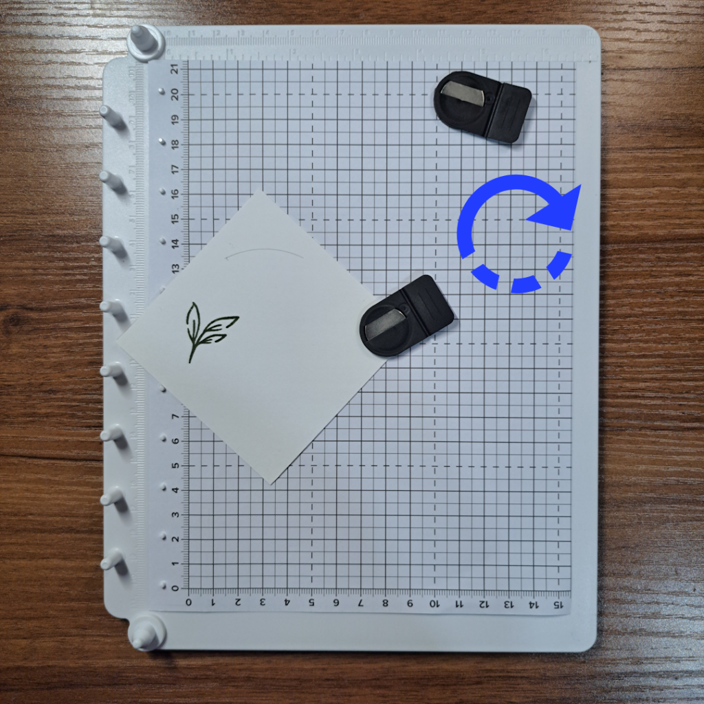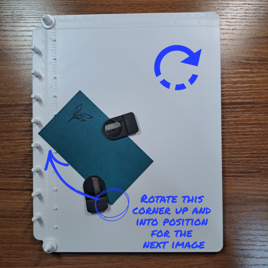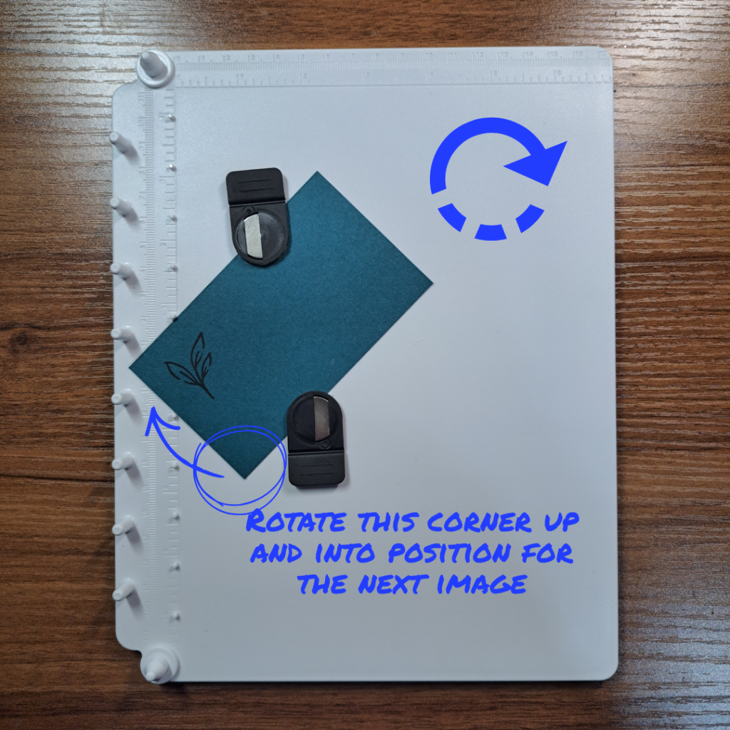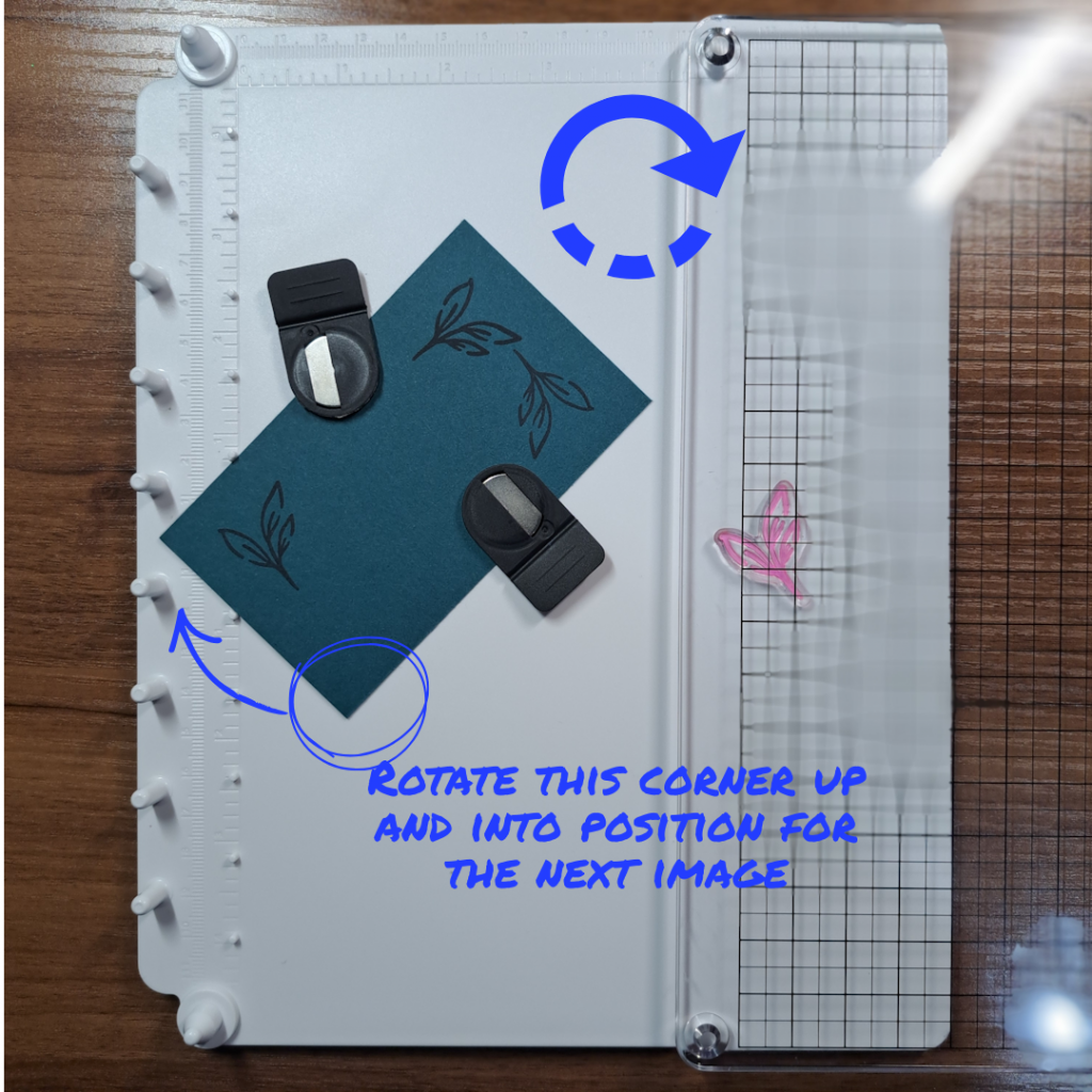 For the next image, rotate the paper and fit the next corner into the 90 degree guide. Without changing the position of the stamp, re-ink and apply the stamp (already attached to the clear cover) back onto the base and stamp. Lift off the cover, re-ink the stamp, rotate the paper to the right fitting the next corner into the slot and stamp again. Repeat one more time to close the circle (or in this case stamp all four corners).