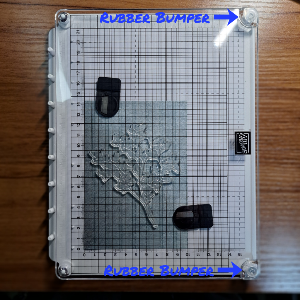 Position your paper on the base and use the magnets to hold the paper down. Place your stamp face down where you want it to be stamped onto your paper. Next, take a look at the clear plastic piece, you will notice that it has a hole in each of the four corners. Two of the holes are covered by rubber bumpers and two are left open. Place the open holes over the large pegs on the base. The clear plastic piece will rest on the pegs and their bumpers on one side and on the bumpers affixed to the clear plastic on the other.