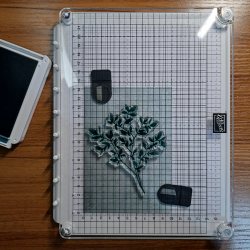 Begin by placing your paper onto the base and adding the magnets to hold it down. Be sure you make note of where the paper is placed in case the stamp pulls the paper up when attaching the stamp to the clear plate.