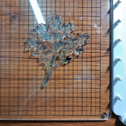 The third photograph illustrates the placement of the second round of stamping. The die is placed back down on the piece to check the placement (I should have left the pencil circle but never mind, I have the die and I will remember to not erase the circle next time.) I left the die in place and put the clear plastic cover over the top and pressed down to pick up the stamp. I moved it out of the way after picking up the die. It is this ability to place the stamp down and then pick it up ‘insitu’ that makes this stamping method work.