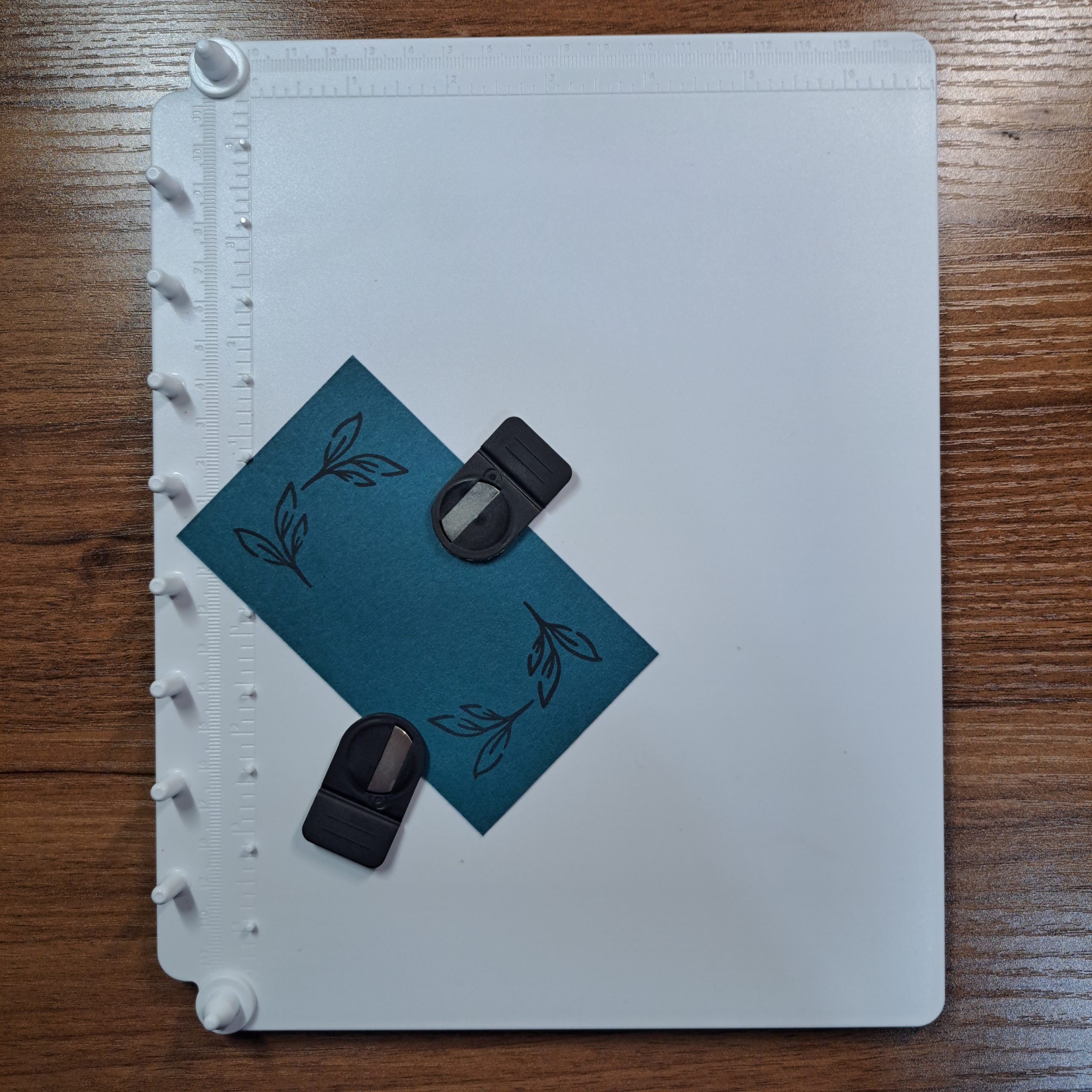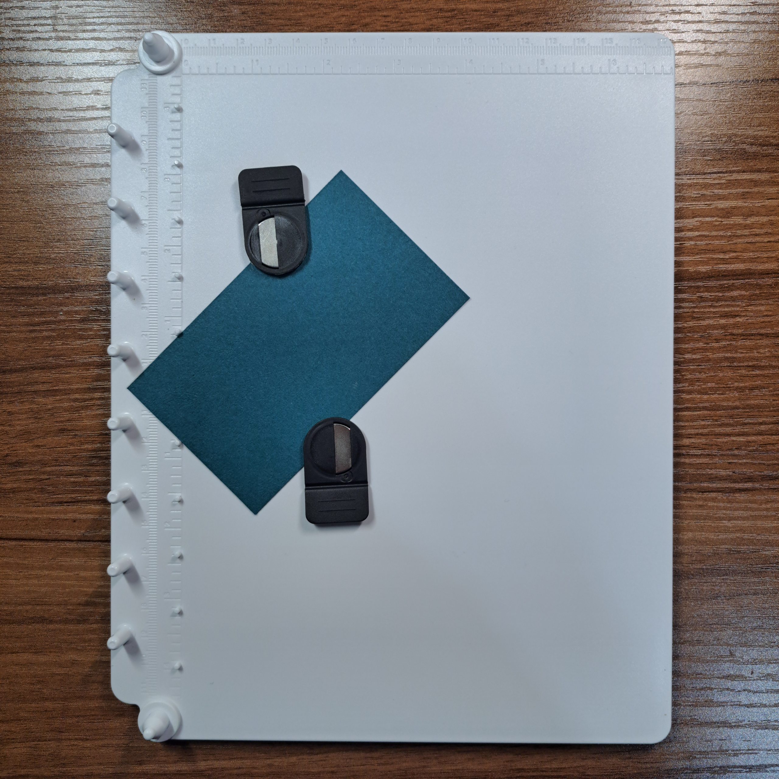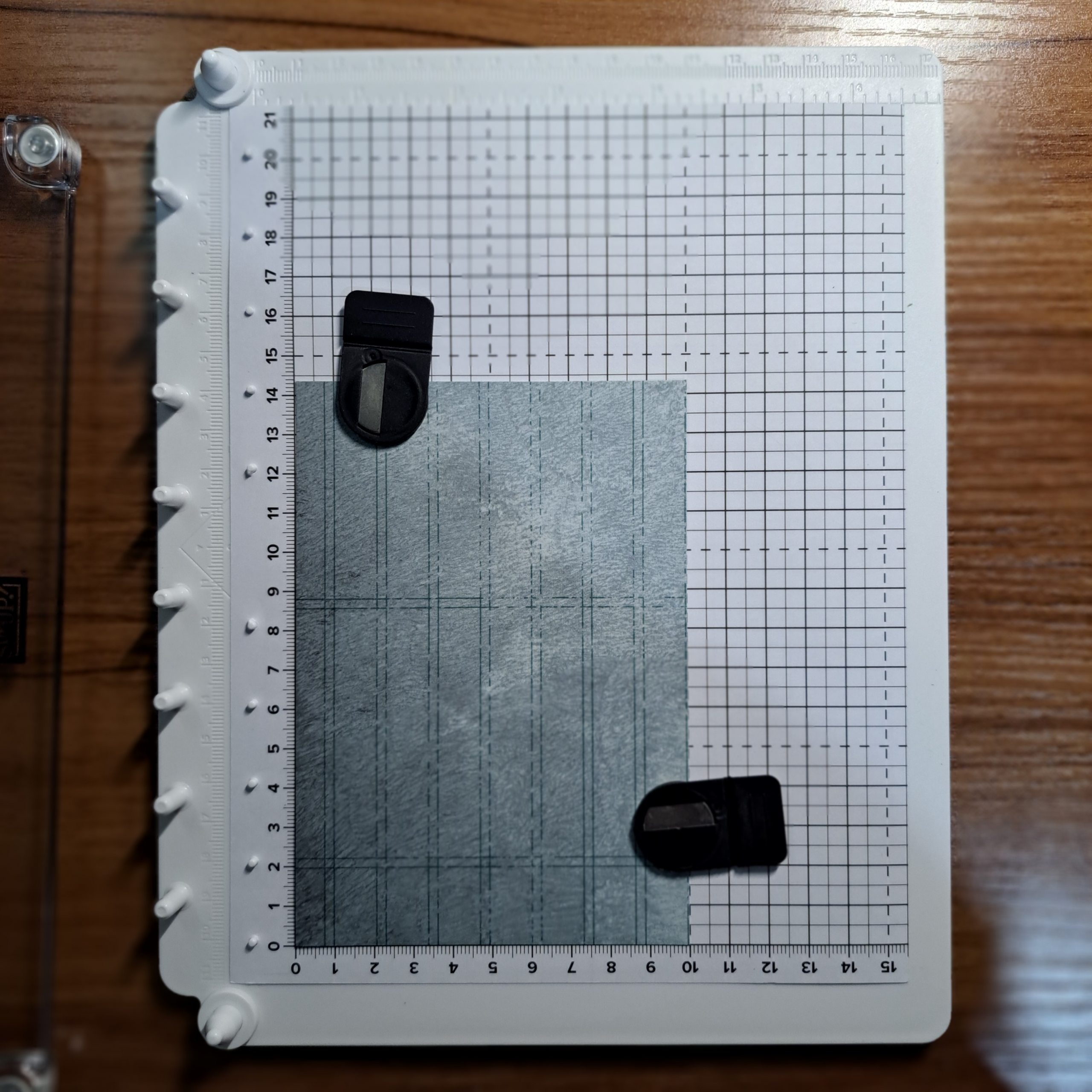 For this exercise place the base as shown in the photo with the pegs on the left. This is just my preference for illustration, you can just as easily orient the base with the pegs at the top. You may also note the grid present on the base. This is grid paper, it is sold separately and not necessary when using the Positioner. But I feel you will get much more out of this tool if you get yourself some to use. The paper has a metric grid on one one side and on the reverse the Imperial grid.