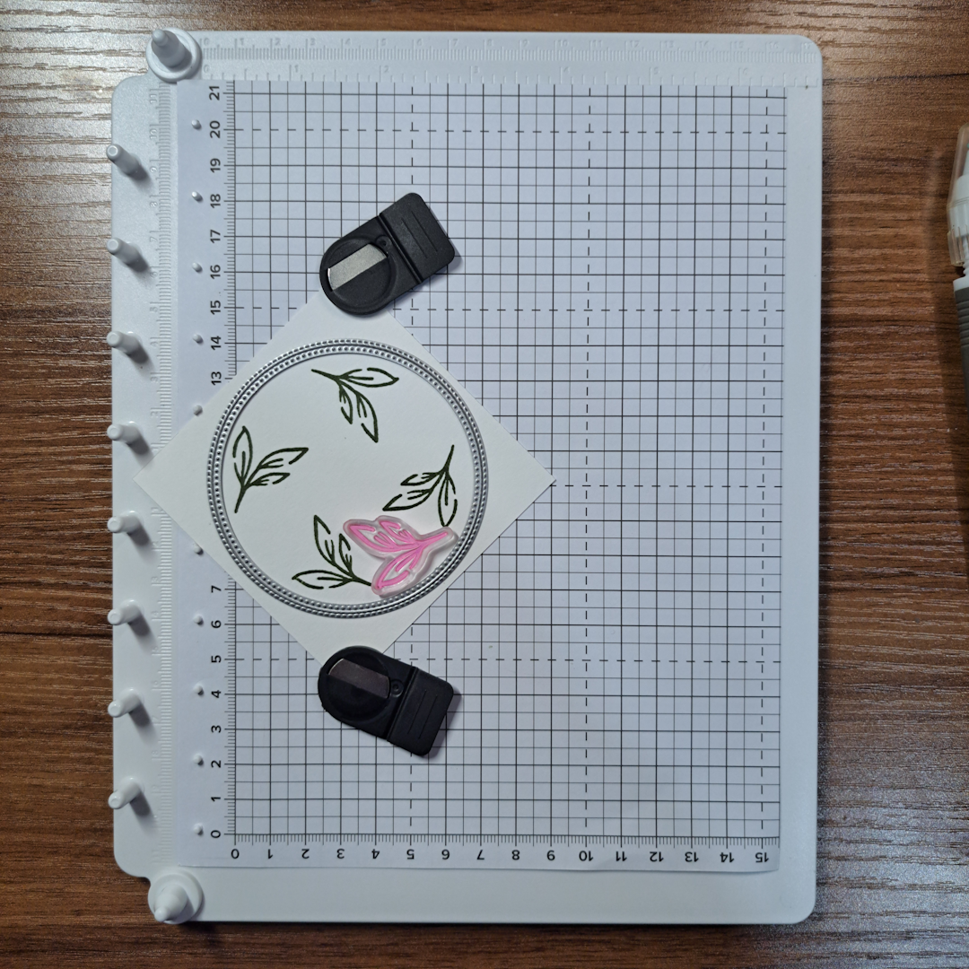 To help with stamp placement I lightly drew around the inside of the die with a pencil. In the photo above and to the left, I had already erased most of the circle when I realized this would be a great example photo. I was erasing it because once the stamp is placed on the clear cover you don’t move it and you don’t need the circle for this stamp placement any more.