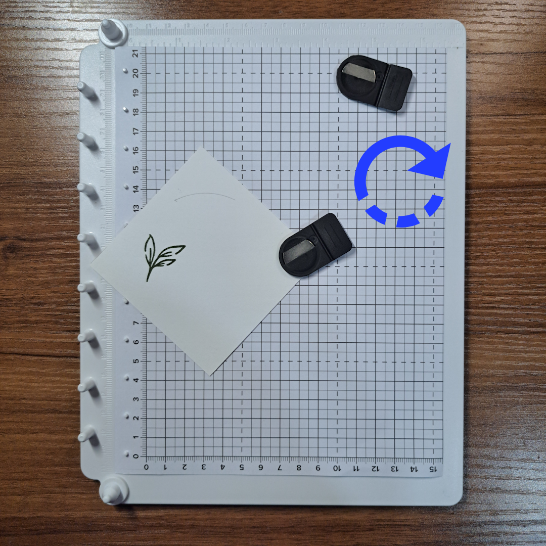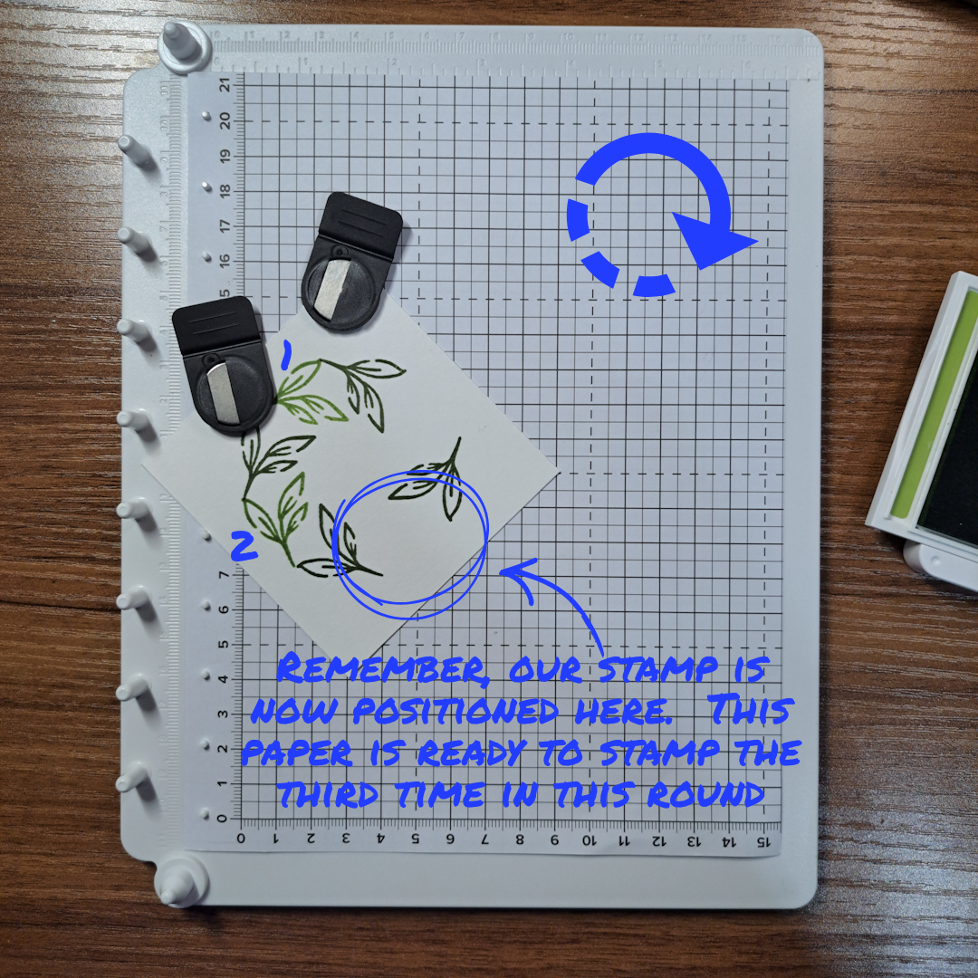 Place your paper down on the above mentioned lines. For this example we are doing a simple corner stamping using the circle method. Place your stamp down onto the paper in first position.