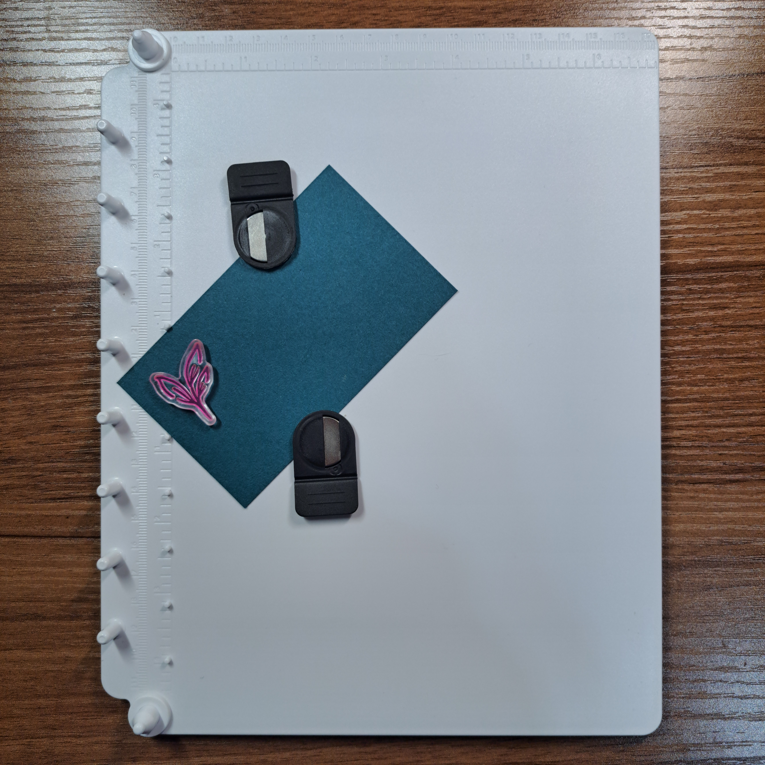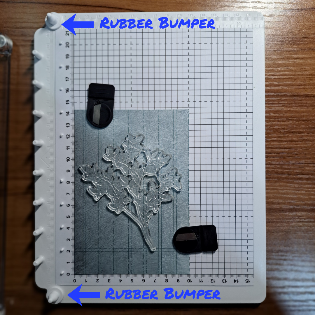 Begin by placing your paper onto the base and adding the magnets to hold it down. Be sure you make note of where the paper is placed in case the stamp pulls the paper up when attaching the stamp to the clear plate.