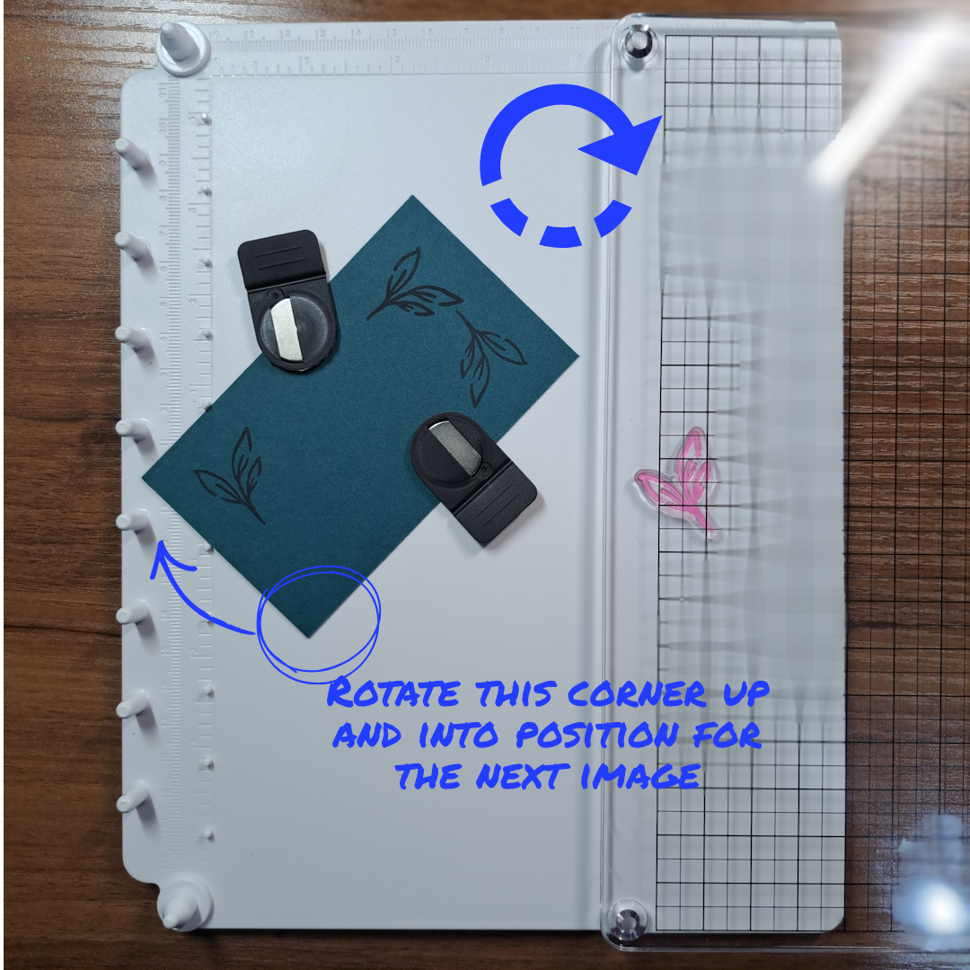 For the next image, rotate the paper and fit the next corner into the 90 degree guide. Without changing the position of the stamp, re-ink and apply the stamp (already attached to the clear cover) back onto the base and stamp. Lift off the cover, re-ink the stamp, rotate the paper to the right fitting the next corner into the slot and stamp again. Repeat one more time to close the circle (or in this case stamp all four corners).