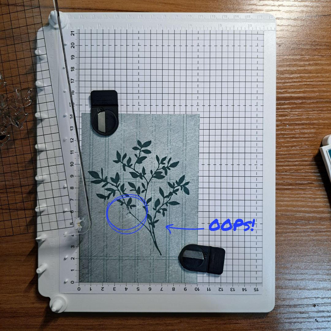 I turned the clear piece over to lay it on my desk to clean the stamp and saw the ink still on the stamp. I admit to uttering a few choice words before I realized that this was the perfect opportunity to really test this thing. So I immediately flipped the clear piece, still with the stamp on it, over and placed back onto the base. I pressed down on the part of the stamp that I had missed, sending a little prayer up that this would work and ta-da! Success!